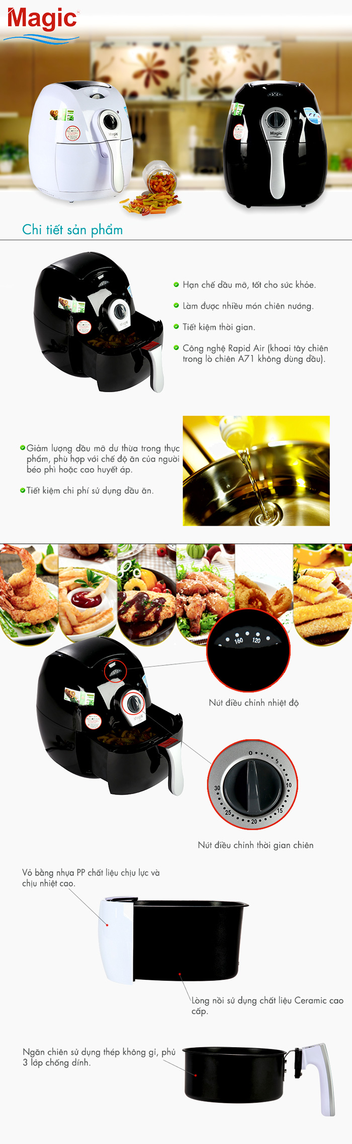 Nồi chiên chân không đa năng Magic Korea A71 là nồi chiên thế hệ mới của thương hiệu gia dụng nổi tiếng Hàn Quốc- Magic Korea. Việc nấu ăn hàng ngày của bạn sẽ được thay đổi hoàn toàn nhờ vào chiếc nồi chiên thông minh này.